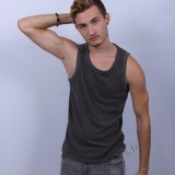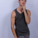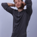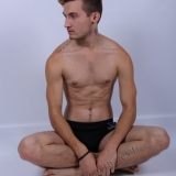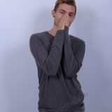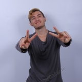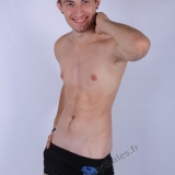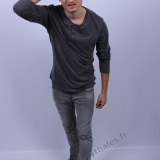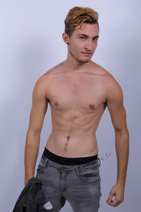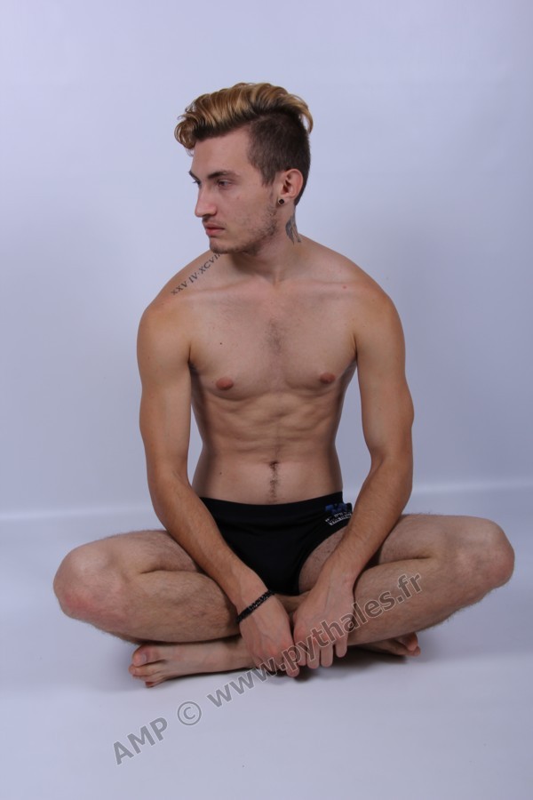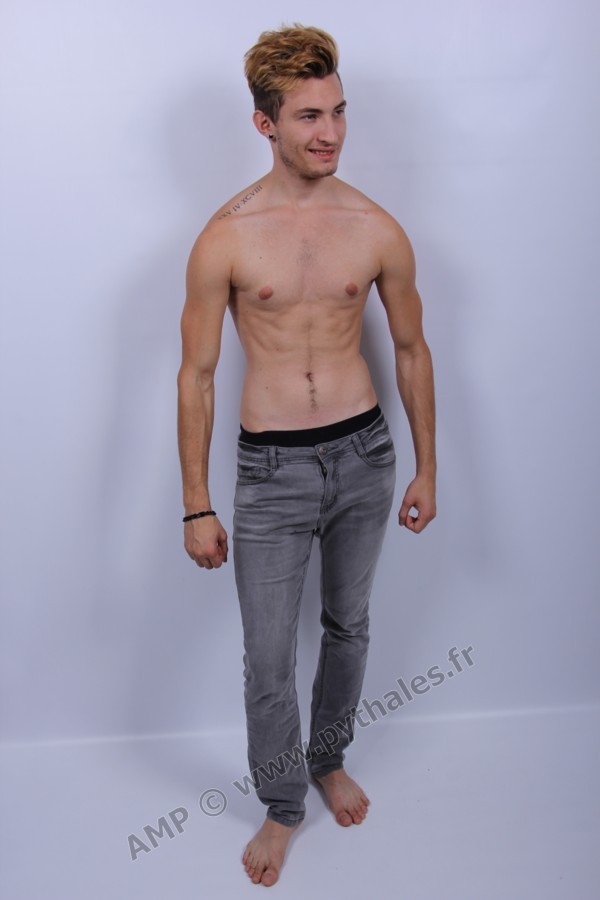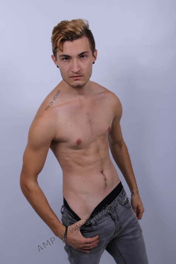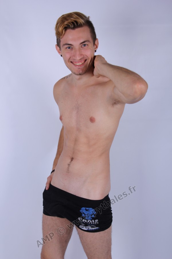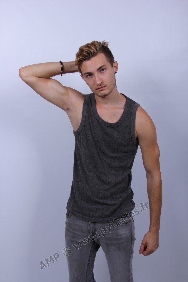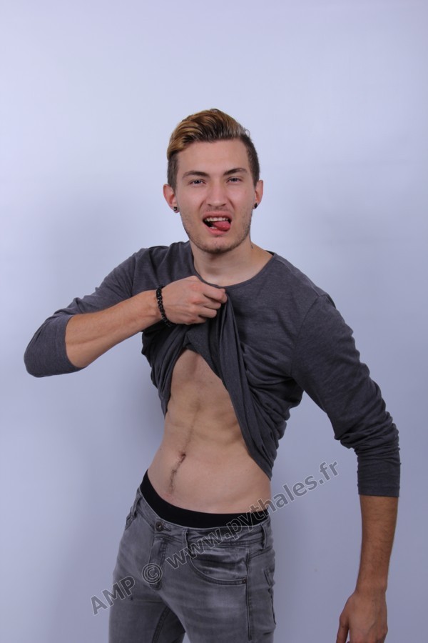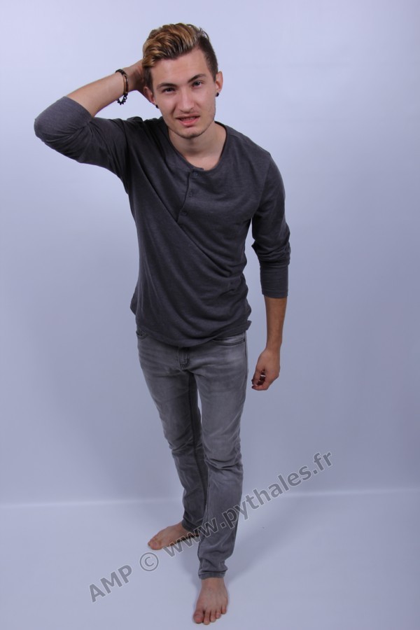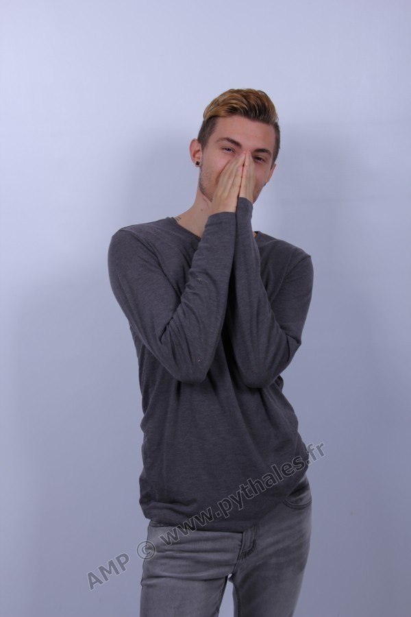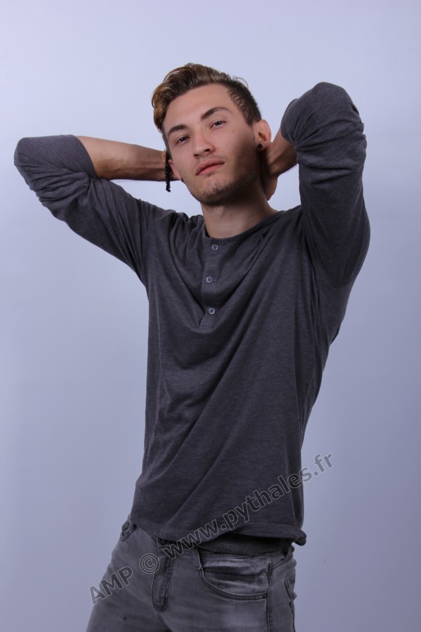 en studio avec un fond blanc.