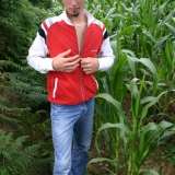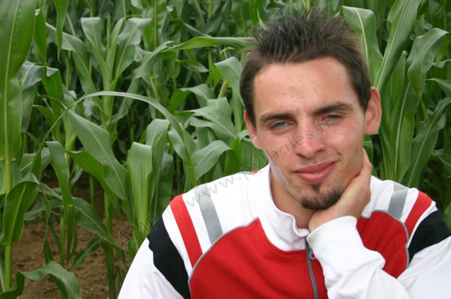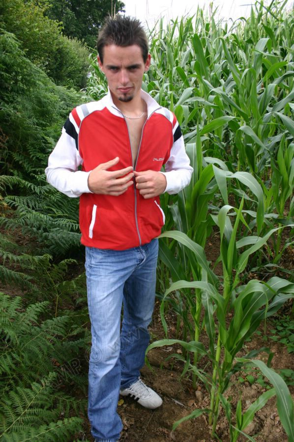 Une vieille grange dans un champ, des pommiers et un champ de mais