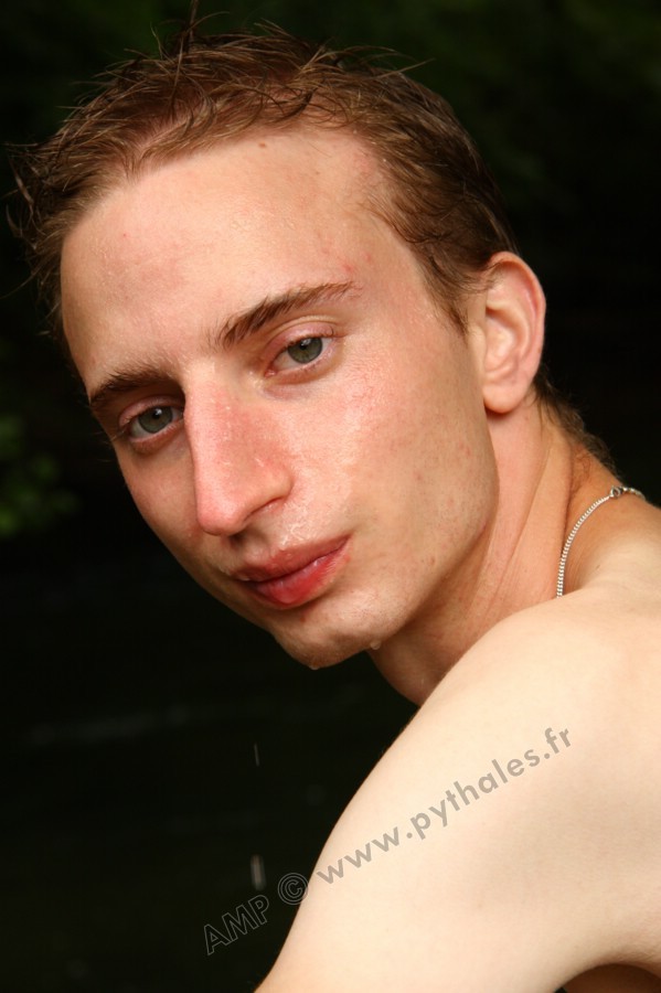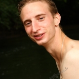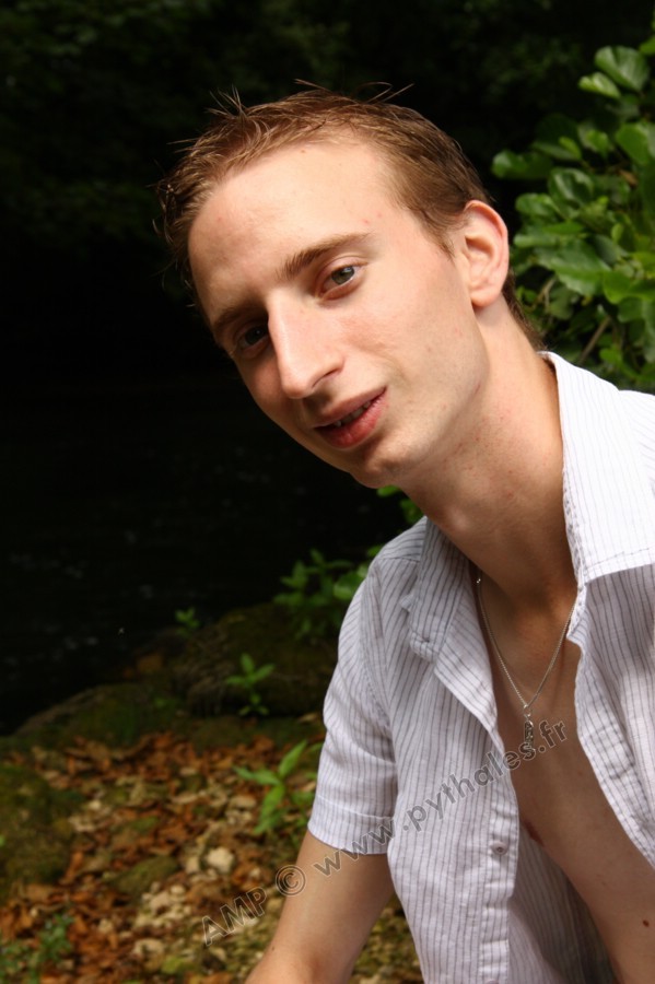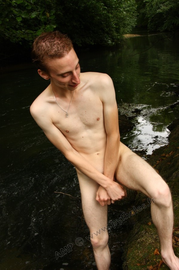 les pieds dans l'eau de la rivière et près d'un vieux tronc d'arbre