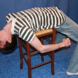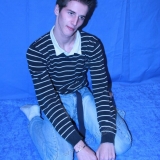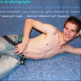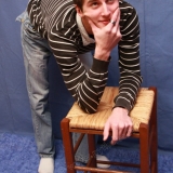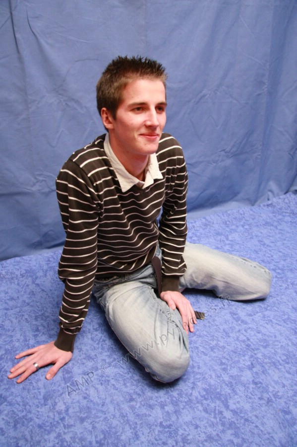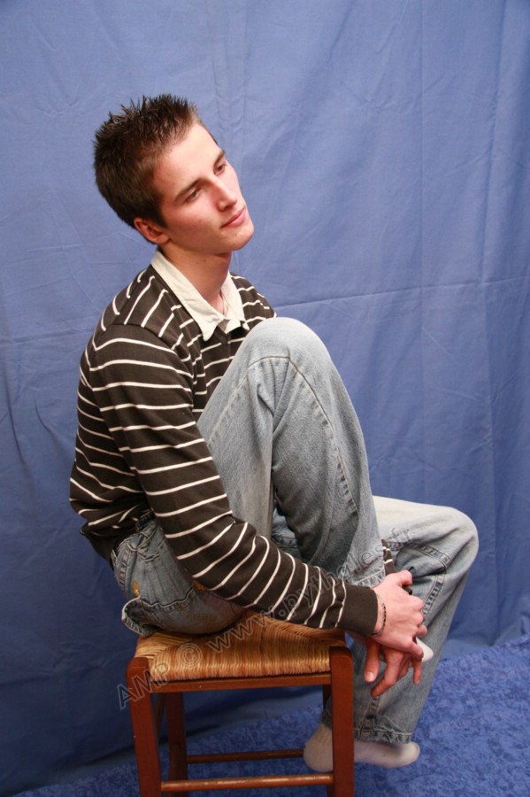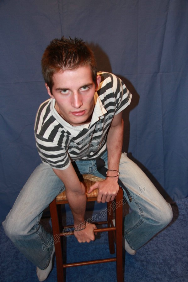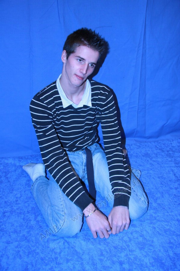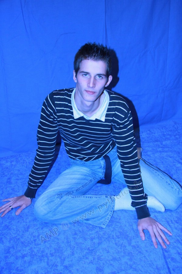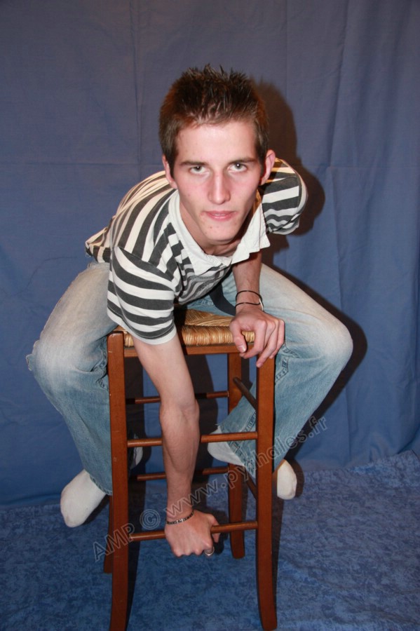 Encore un fond bleu, mais avec un autre gilet et un tabouret
