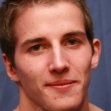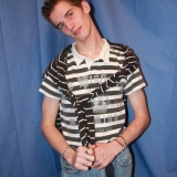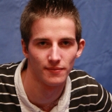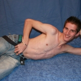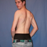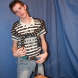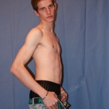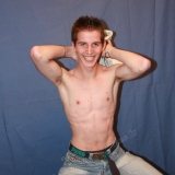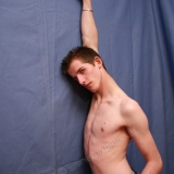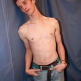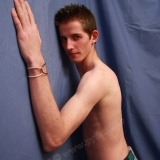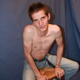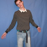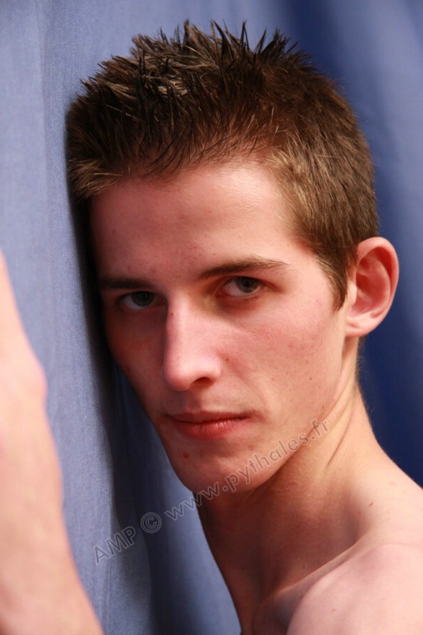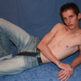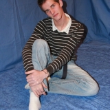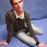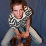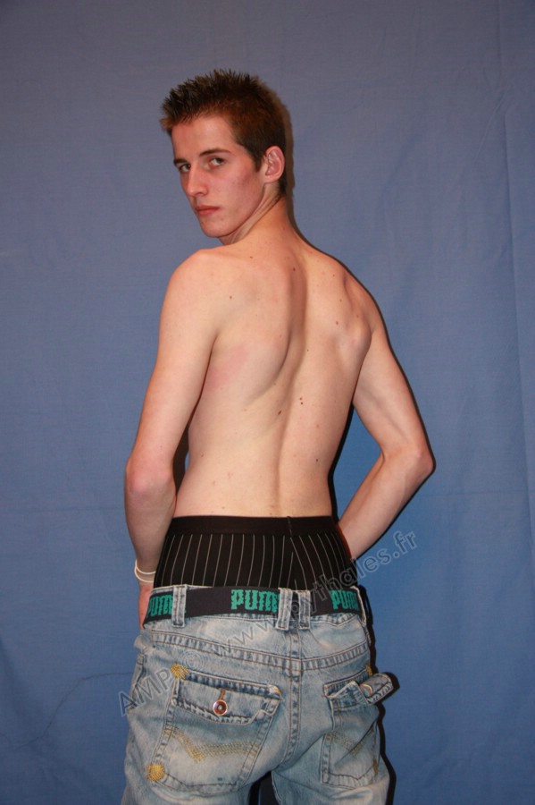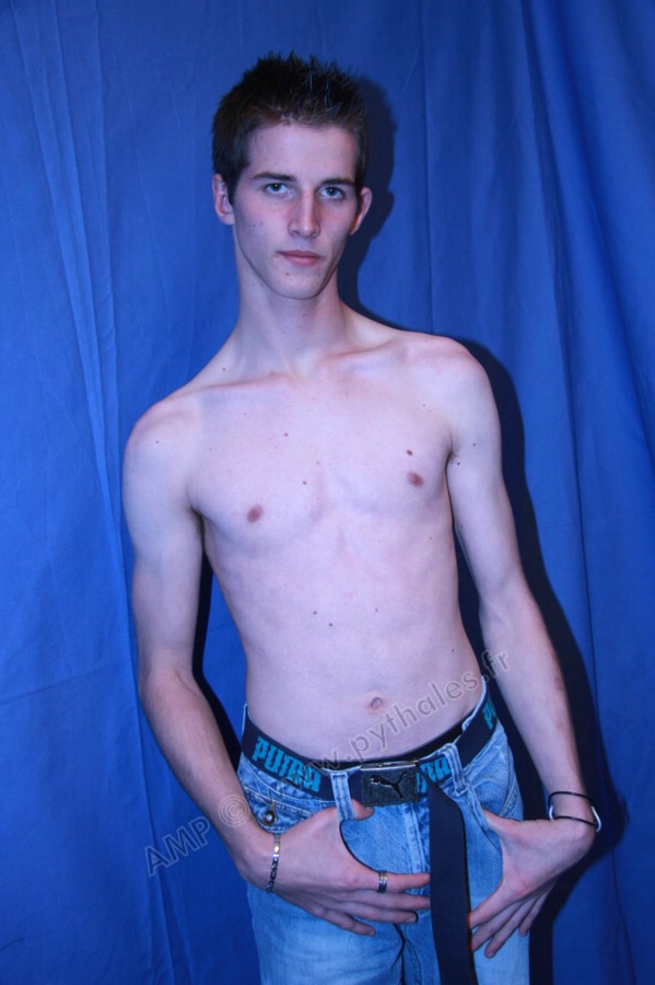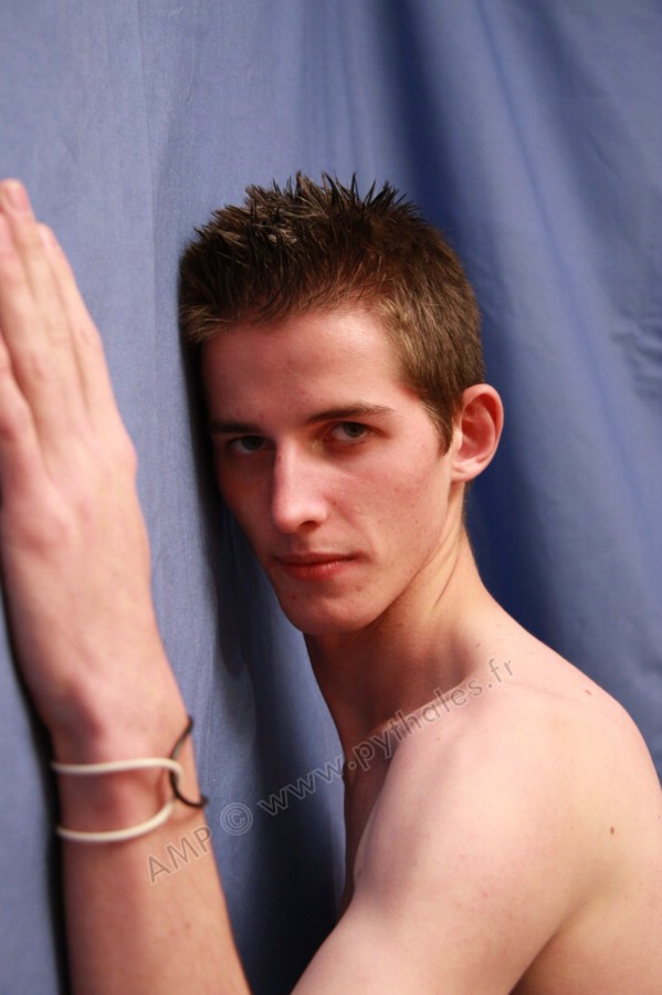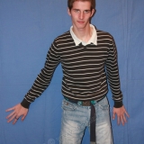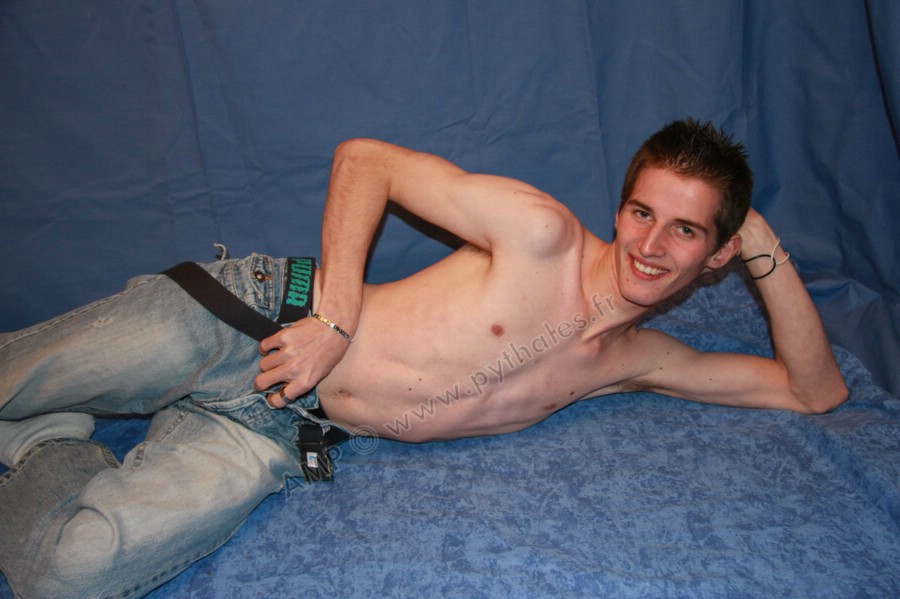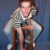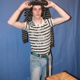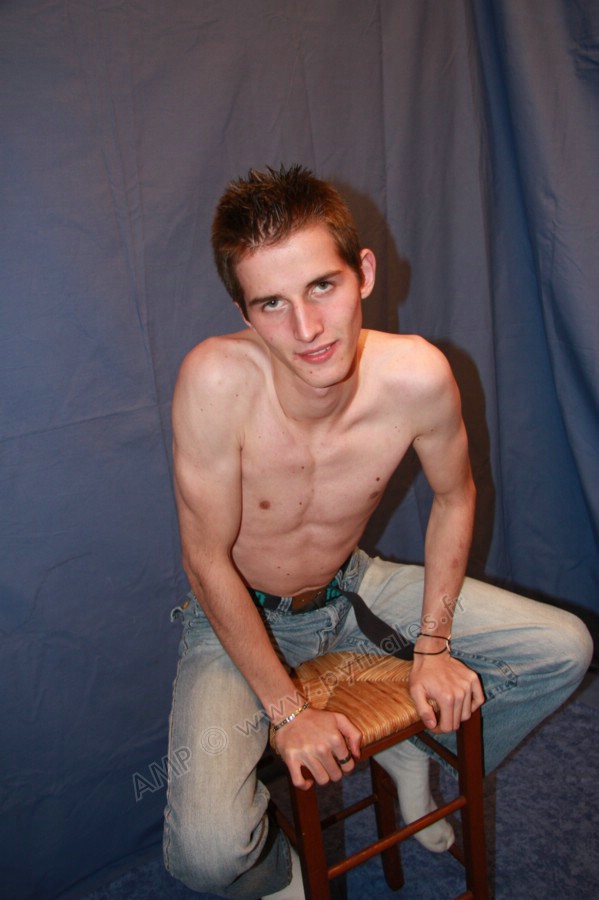 Encore un fond bleu, mais avec un autre gilet et un tabouret