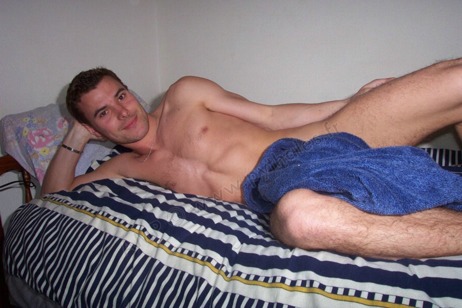 Sur un lit avec une couverture rayée et des essais d'éclairage
